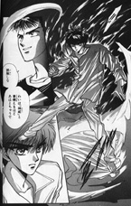 Laying out panes and carefully drawing their contents and measuring overlaps is an art-form exclusive to manga. You really can't split up a screen of anime and do pane composition in this manner. If any of you remember seeing JoJo's Bizarre Adventure last fall, recall how strange it seemed when in moments of group surprise, panes of each character's face flashed onto the screen with a crackling sound. It just doesn't work well for motion-media. The skill of positioning panes and making overlaps look good is not a simple matter. In Exhibit B, notice how the drawing of Kamui's leg in one pane overlaps into a neighboring pane, yet the scaling and positioning are just right so that even though his foot is less than ½ a centimeter from his eyebrow, the composition doesn't look strange at all. In fact, you don't even notice how close his leg comes to his face unless you specifically look for it. I lent my copies of X to a friend once. When he gave them back to me, he made a comment that the layout was such that each page was a work of art of its own, with the panes flowing into each other in a very natural and artistic manner. Such individual detail is lost in an anime at 30 frames/sec. but is exceedingly important in manga. |